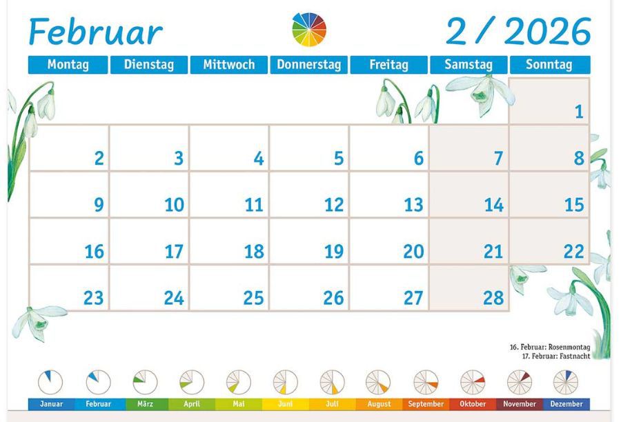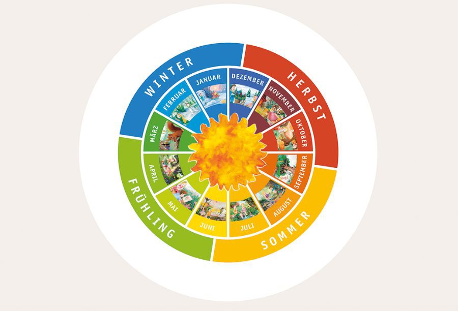 Die Farben der Jahreszeiten und Monate haben symbolischen Charakter, z. B. Winter: blau-kalt.
